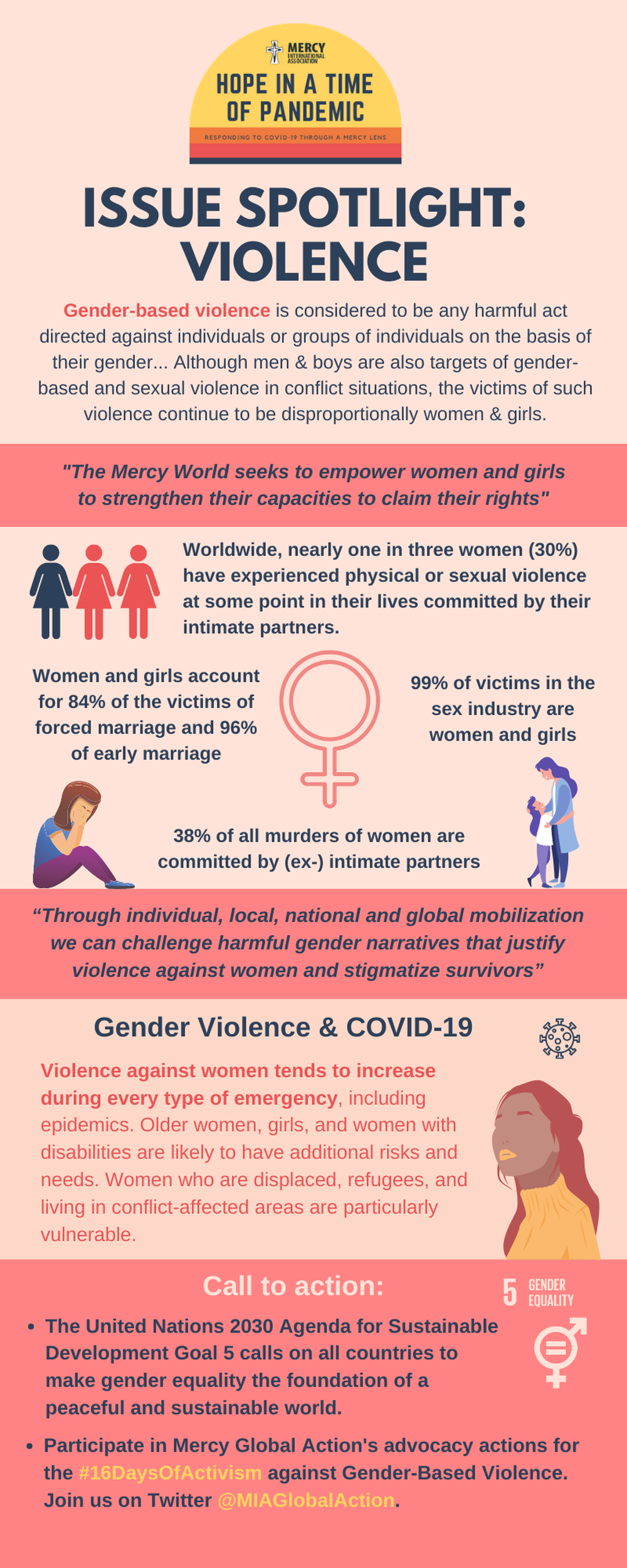 As the 16 Days of Activism against Gender-Based Violence are soon to begin, we encourage the Mercy World to be part of the action for change. As outlined in ‘Hope in a Time of Pandemic’, the Mercy World continues to strive to eliminate gender-based violence and human trafficking by addressing the lack of prevention, access to services and other social protections. The Mercy World seeks to empower women and girls to strengthen their capacities to claim their rights. Through individual, local, national and global mobilization we can challenge harmful gender narratives that justify violence against women and stigmatize survivors. Like Catherine McAuley, we will continue to work with women and girls to form a just and inclusive world.