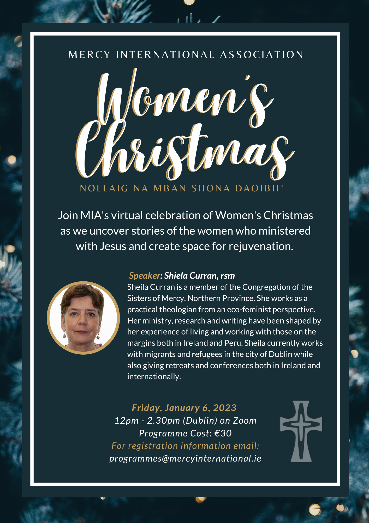 Mercy International Association is pleased to announce a virtual celebration of Women's Christmas which will take place on Zoom on Friday, 6 January 2023. Women’s Christmas is an Irish tradition to mark the Feast of the Epiphany. The retreat will uncover stories of the women who ministered with Jesus. MIA would like to invite all within our Mercy community to gather virtually to pray, reflect, and celebrate together the gifts and challenges of this past year. Email programmes@mercyinternational.ie to register.